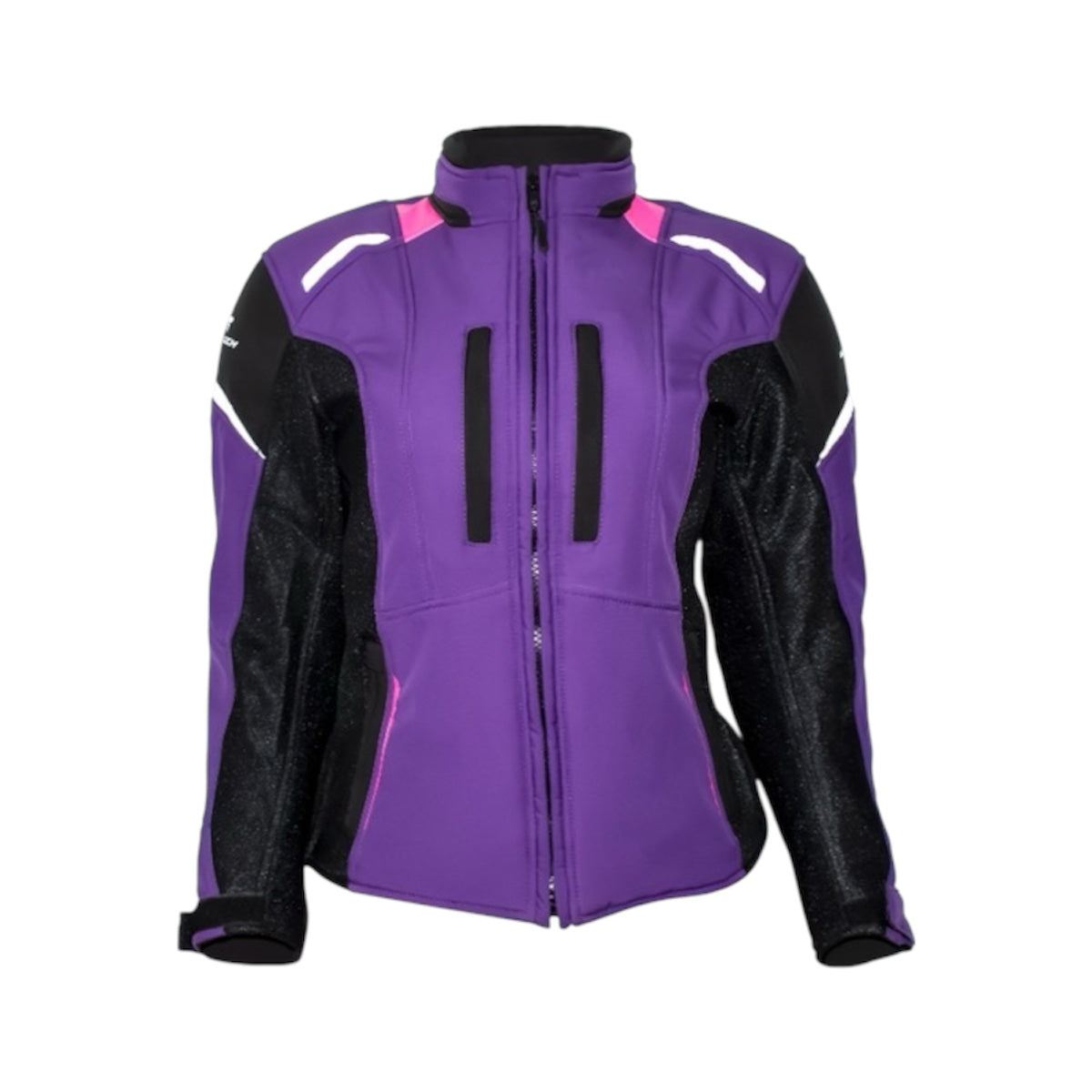 CHAMARRA SOFTSHELL PURPURA C/NEGRO, 60% SOFTSHELL 40% MESH, PROTECCIONES CERTIFICADAS EN CODOS Y HOMBROS, INCLUYE ESPALDERA, AJUSTES DE VELCRO EN MUÑECAS Y CINTURA, AJUSTES DE CIERRE EN ANTE-BRAZOS, BOLSILLO TRASERO EN ESPALDA BAJA, DETALLES REFLEJANTES EN PUNTOS ESTRATEGICOS DE LA PRENDA